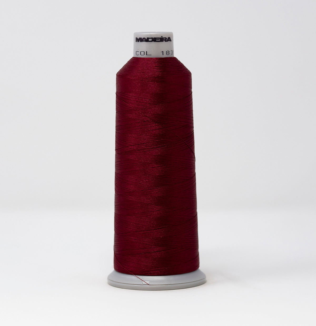 Madeira1835 -- 5,500 yard cone of #40 weight Cranberry Red polyester machine embroidery thread.
